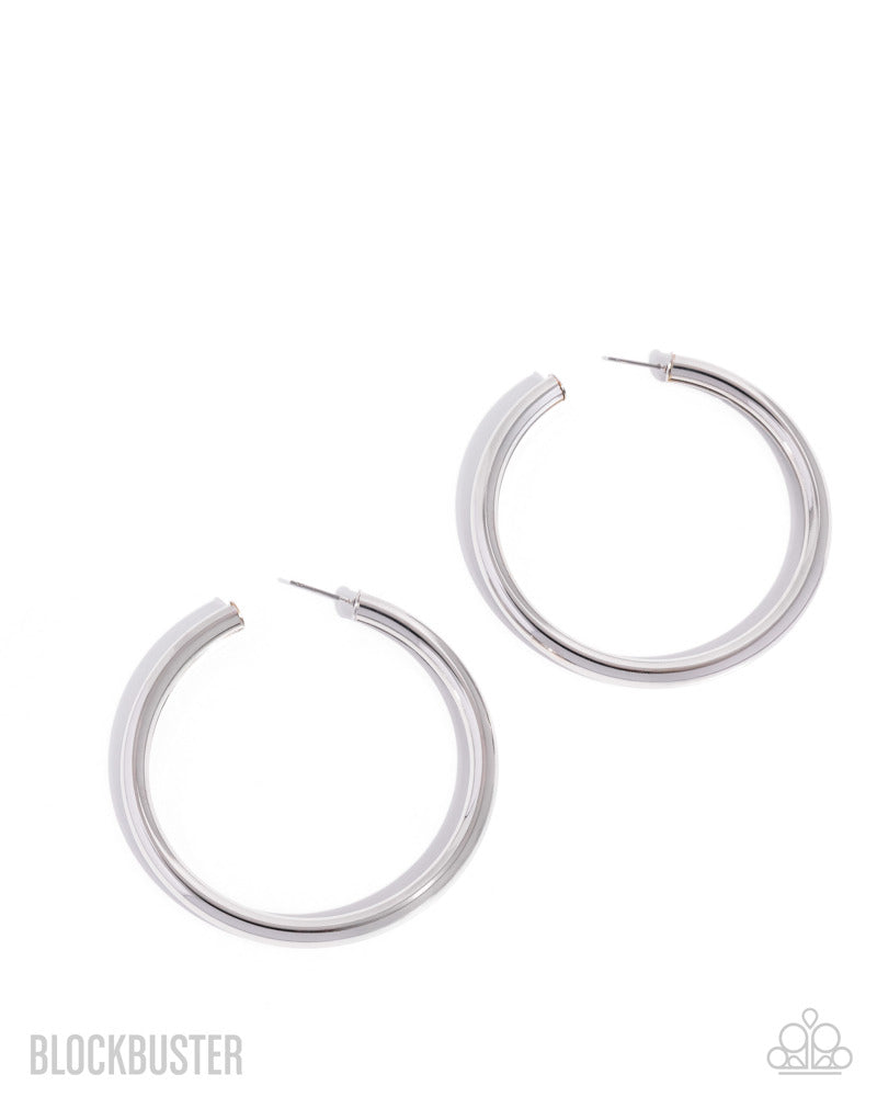 A thick silver bar delicately curls into a glistening oversized hoop for a retro look. Earring attaches to a standard post fitting. Hoop measures approximately 2 1/4" in diameter.