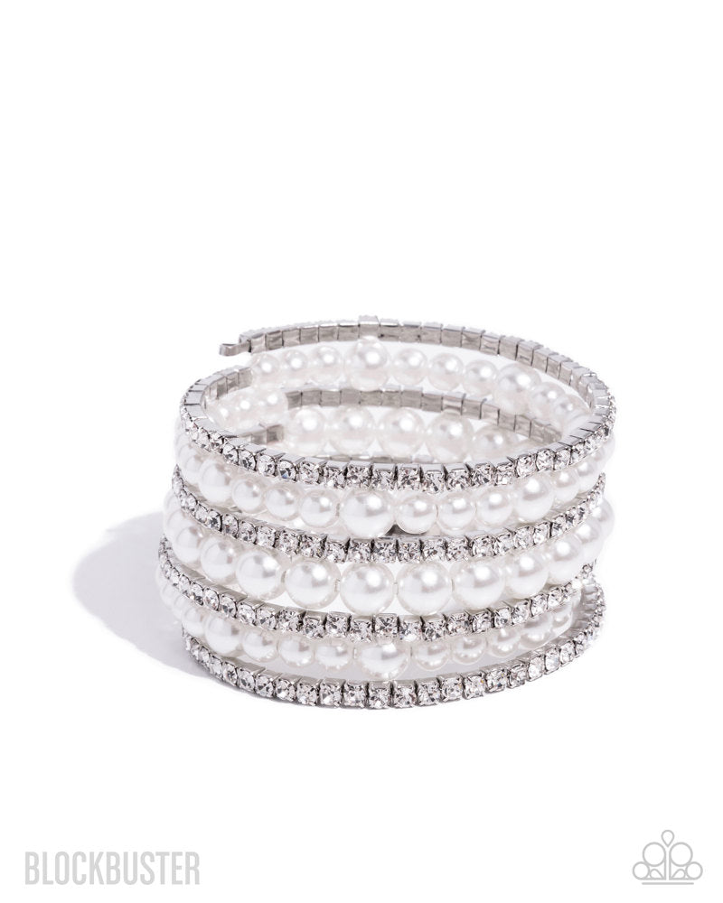 Threaded along a coiled wire, rows of white pearls in varying sizes and white rhinestones in square silver fittings alternate along the wrist, creating an elegant infinity wrap-style bracelet.